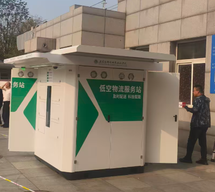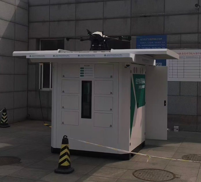 服务站采用外开八舱智能物流柜设计,可同时容纳 8 个标准物流箱,依托顶部集成的无人机起降平台,支持无人机通过 RTK 技术实现厘米级精准降落;降落过程中,柜顶感应装置自动开启舱门,无人机通过机械臂完成包裹投放,全程无需人工干预,单次存取循环仅需约 150 秒,真正实现了自动化、无人化的高效配送。